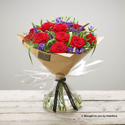 Our skilled florists use the finest ruby red roses, purple lisianthus for contrasting colour pop and luxury greenery for texture. Naomi roses are known for their rich red colour, large petal head and luxurious feel.