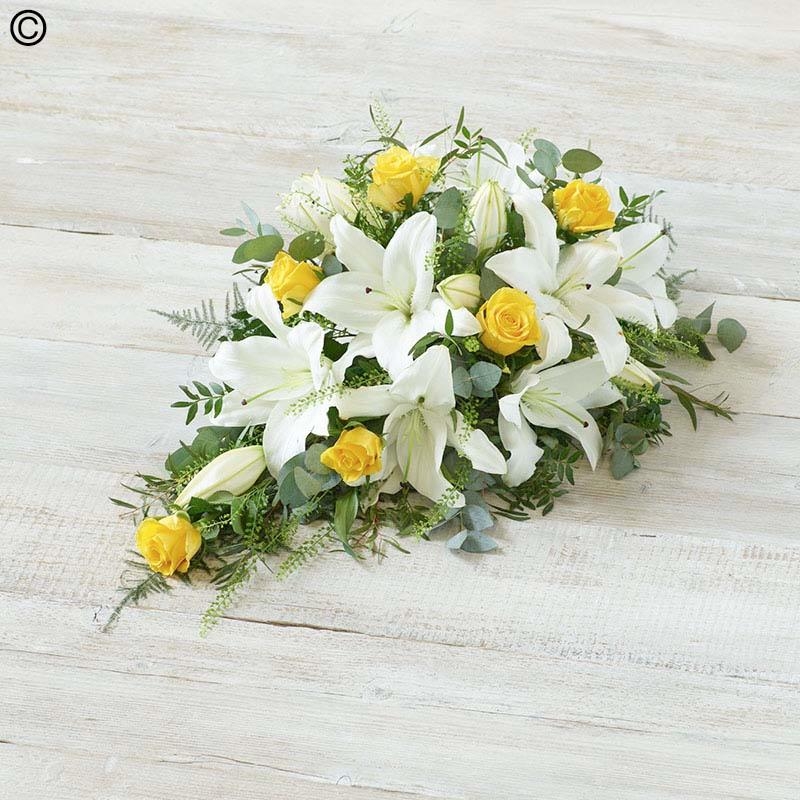 An elegant tear drop-shaped arrangement featuring delicate foliage and large fragrant oriental lilies, combined with gorgeous roses.